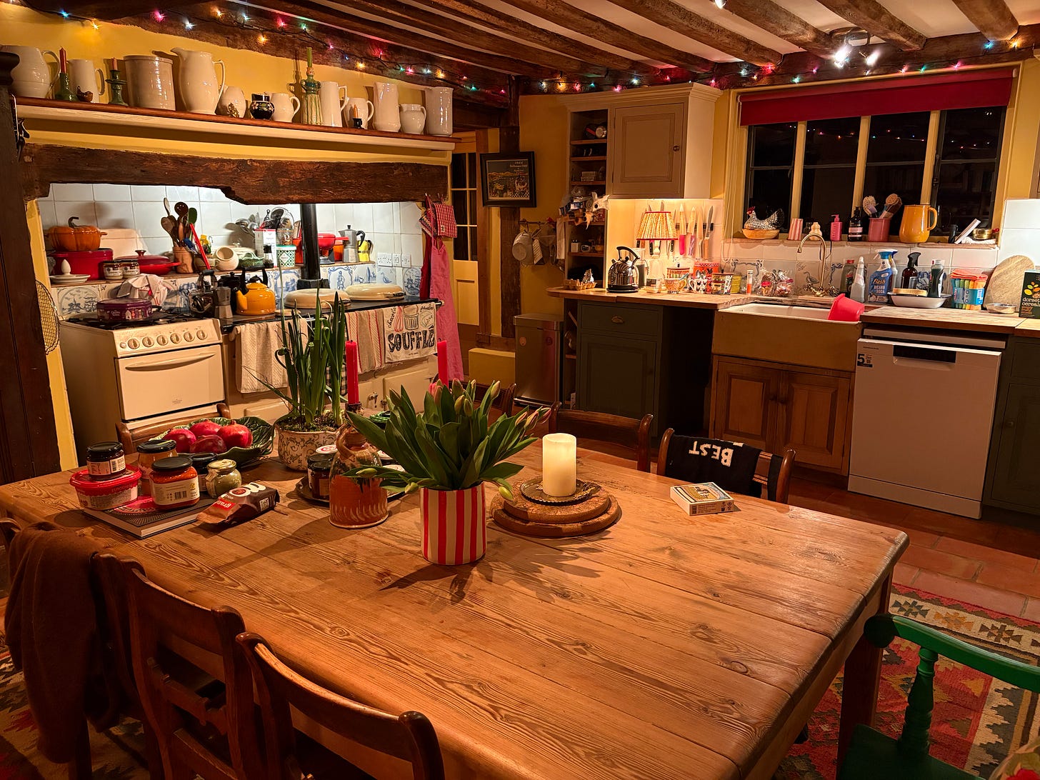 As noted, I am still in sloth-like slow motion, apart from house stuff. The lime plaster person is starting next week, hooray, and I am having a lovely time looking at paint colours (as you’ll know from my book if you’ve read it, I love the transformative power of paint). Here was the kitchen one night this week. I’m so glad I went for yellow.